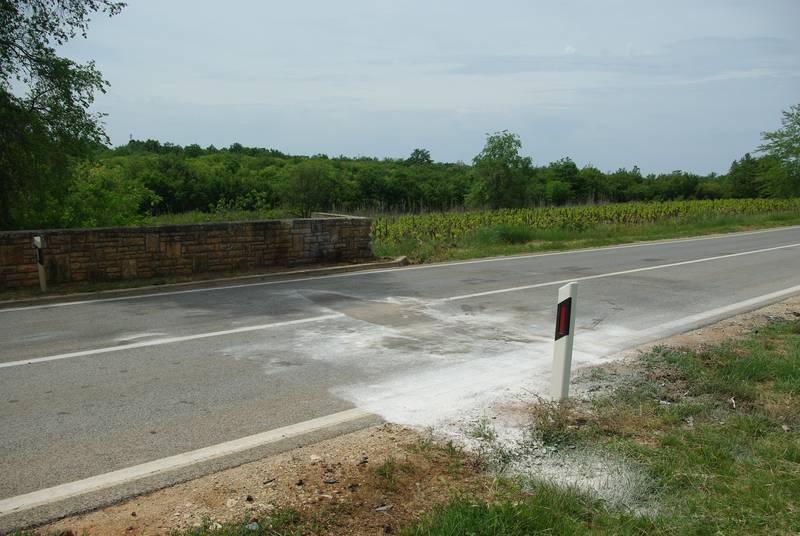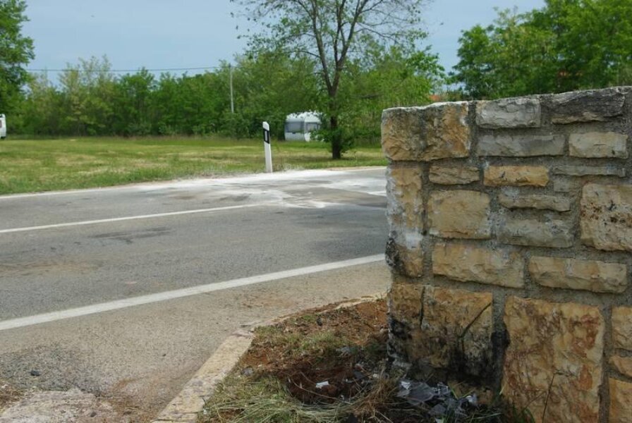 Mladi je vozač, vozeći Renault Clio se u smjeru Baderne, po izlasku iz blagog desnog zavoja na ravni dio ceste prema selu Ladrovići izgubio nadzor nad vozilom i sletio udesno te prednjim dijelom vozila udario u kut kamenog zida na rubu parcele uz cestu. Prethodno je "pokupio" prometni znak.