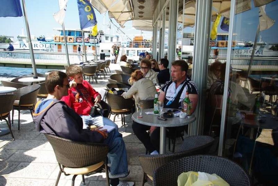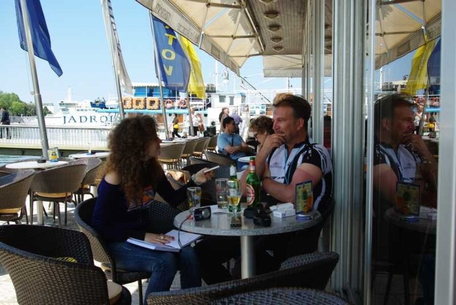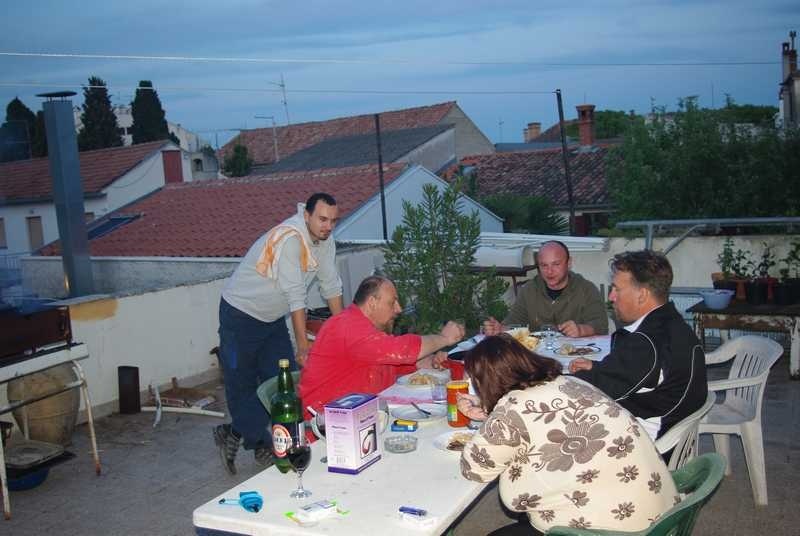 Po ulasku u Biograd na moru, nazivamo Malog, našeg puležana, koji nas je kontaktirao dan prije i zaprijetio da će se naljutiti ako ga ne posjetimo. Inače mu je tu djedovina i baš ovaj tjedan je u Biogradu poslovno. I ubrzo se nalazimo na prostranoj terasi u centru toga grada, u „Klubu Istrijana dalmatinske županije“. Jer za stolom nas je sedmoro, svi Istrijani.