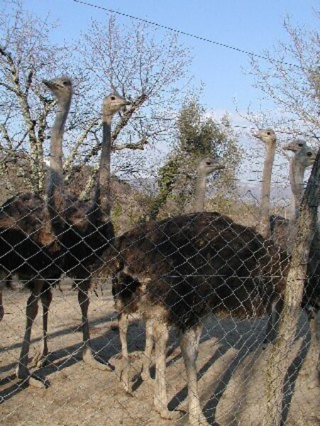 , pronašli smo pravu farmu tih velikih ptica. Po izlasku iz automobila, nojevi su nas zainteresirano pratili duž cijele žičane ograde te radoznalo promatrali našu fotografsku opremu. Na svaki naš pokret reagirali su širenjem perja, a mužjak nam osim te geste, svoje nezadovoljstvo posjetom pokazivao i otvaranjem kljuna. Jednom rječju, koliko god bili atraktivni, nojevi bi nas sigurno bili napali da nisu ograđeni.[slika2]Za one koji to ne znaju: perje na mužjaku tijelu noja crne je boje, a na krilima i repu bijelo. Ženka je smeđesiva, a na krilima i oko repa crnkasta. Na nogama imaju samo dva kratka i snažna prsta (treći i četvrti), od kojih unutarnji na svome kraju ima tupu pandžu. Kod običnog pokretanja korak im je u prosjeku dug oko 1 do 1,5 metara, a kod brzog trčanja od 2 do 4 metra. [slika3]Nojevi narastu oko 2,75 metra u visinu, dugački su oko 2 metra, a teški oko 100 kilograma. Žive u pustinjskim područjima Afrike, i to jednoličnim mirnim životom. Tek u trećoj godini života mogu imati mlade. U doba parenja mužjaci ženke snube posebnim plesom. Gnijezda su im male udubine u pješčanu tlu. Ženka izleže do 15 bijeložutih jaja, od kojih svako teži 1,44 kilograma. Mužjak na njima sjedi noću, a ženka danju. Zametak se razvija 40 dana, a mladi su potrkušci.