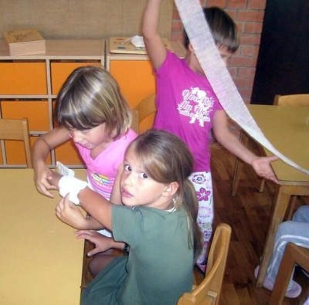 POREČ - Dvije grupe mališana iz porečkog dječjeg vrtića Radost, njih pedesetak, jučer su u sklopu akcije ovdašnjeg Crvenog križa upoznale osnove pružanja prve pomoći. Interaktivnu radionicu koja je počela upoznavanjem sa sadržajem kutije za prvu pomoć – zavojima, flasterima i gumenim rukavicama, vodile su liječnica Vesna Janko-Radovan te Vesna Finderle iz Gradskog društva Crvenog križa. Govorile su među ostalim o previjanju rana čistom gazom ili flasterom i tretiranju opečenog dijela tijela hladnom vodom. Najzanimljiviji dio sigurno je bila vježba previjanja zamišljene rane na ruci, što su polaznici činili u parovima.[slika2]Potom su na poklon dobili slikovnicu koja na njima pristupačan način prikazuje mjere opreza i postupanja u slučaju da se netko ozlijedi. Za kraj su »dvije tete Vesne« ponovile što je prva pomoć, uz napomenu da se ne treba bojati onih koji nam je dolaze pružiti kad smo u nevolji.