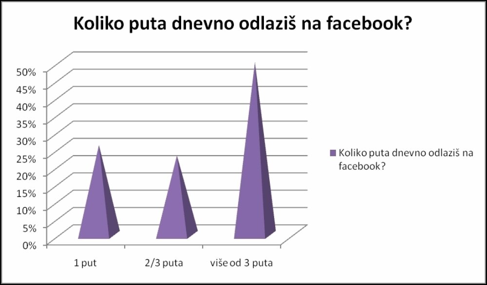 Oni koji imaju facebook najčešće idu na facebook više od 3 puta na dan - 50% ispitanika, 2 – 3 puta na dan 24%, jednom dnevno 26%.