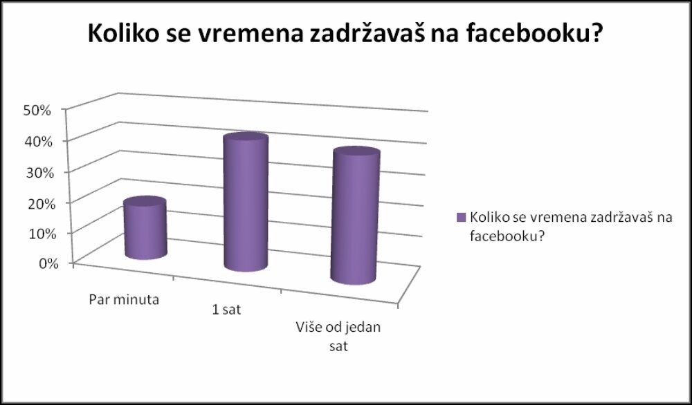 18% ispitanika se na facebooku zadržava vrlo kratko, 42% do 1 sat, a 40 % preko 1 sat.