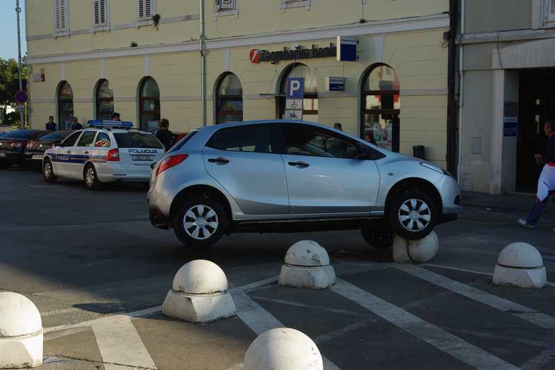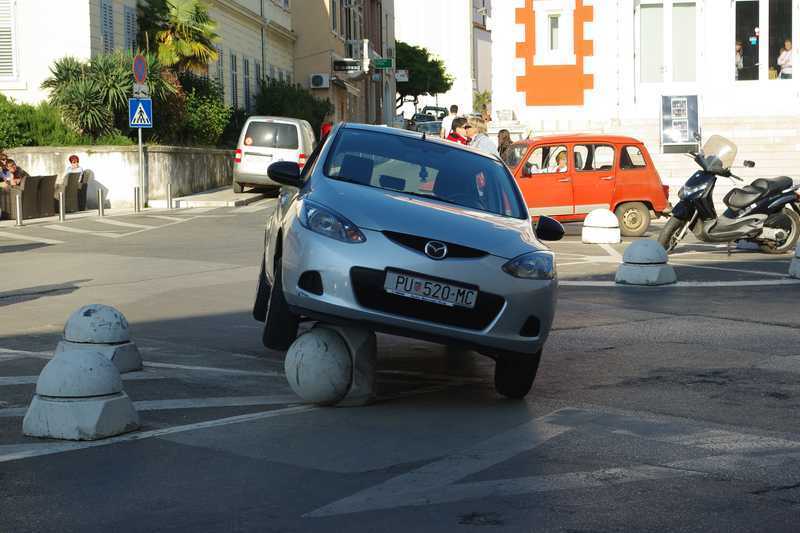 Jedna je vozačica u četvrtak nešto prije 18 sati svojim manevrom u vožnji izazvala poprilično zanimanje brojnih prolaznika kad je svoj automobil uspjela "parkirati" na betonsku gljivu kojom su ograđeni otoci na Narodnom trgu u Poreču.