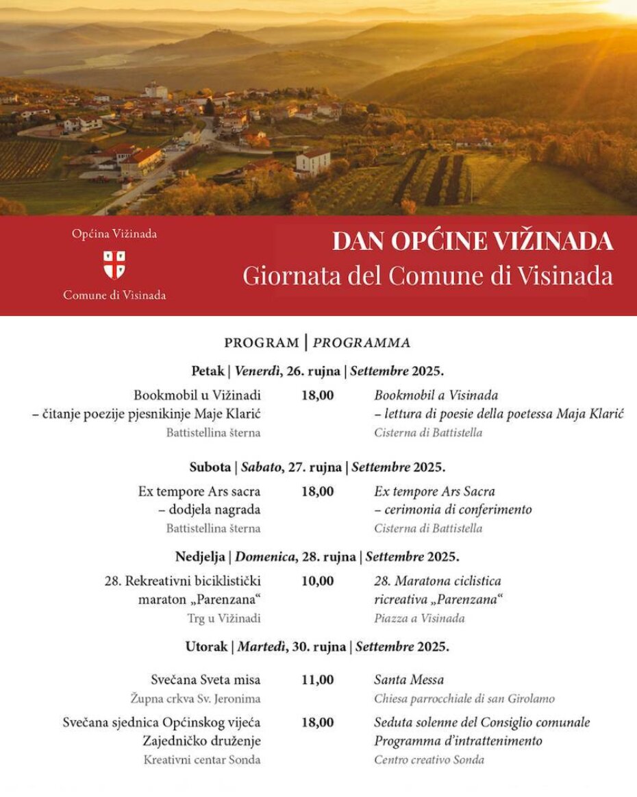 U utorak, 30. rujna, u 11 sati održat će se sveta misa u Župnoj crkvi sv. Jeronima. Svečana sjednica općinskog vijeća, kojom završava obilježavanje Dana Općine Vižinada 2025., počinje u 18 sati u Kreativnom centru Sonda, a nastavit će se prigodnim druženjem uzvanika.