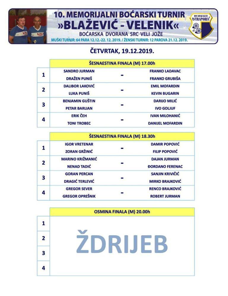 Danas i sutra od 17 do 21:30 na programu su susreti šesnaestine i osmine finala muškog turnira. Osam najboljih parova će se u nedjelju, 22. prosinca na velikoj završnici boriti za naslov pobjednika. Četvrtfinala se igraju od 14, polufinala od 16, a finale i susret za 3. mjesto od 18 sati.