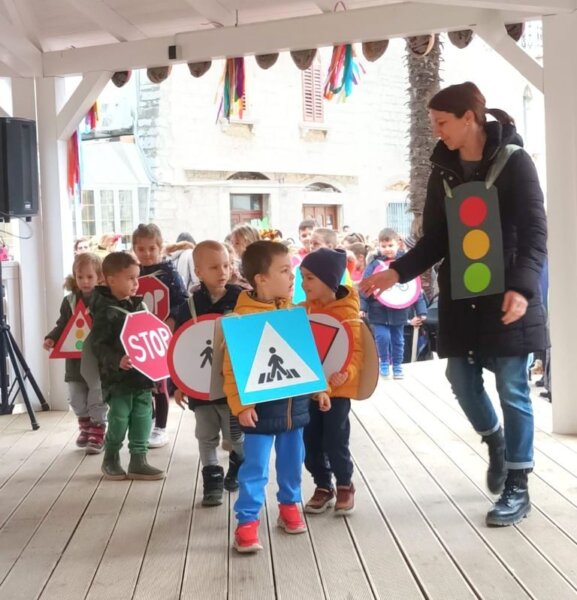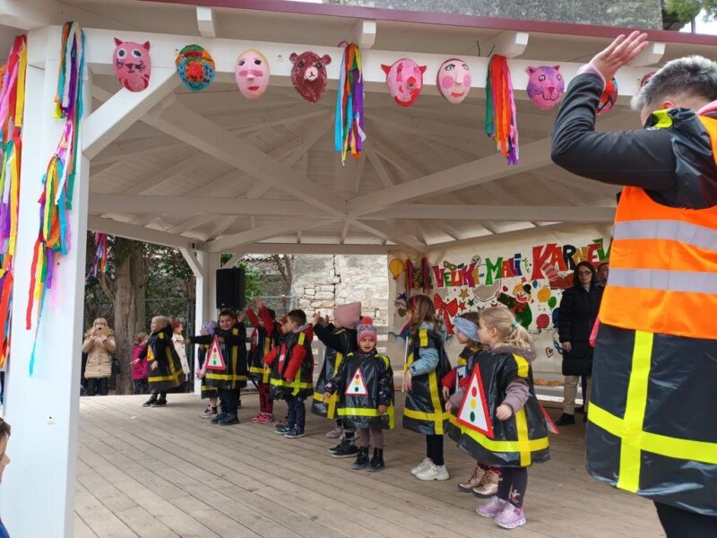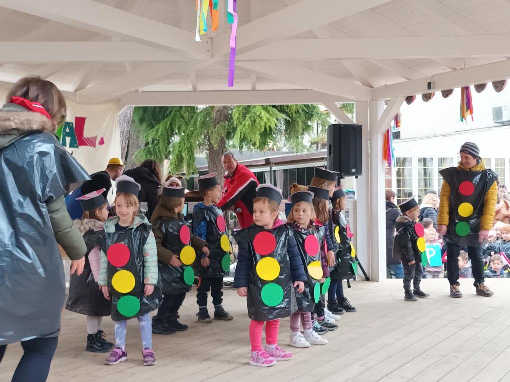 Tako se publici predstavilo 15 maškaranih skupina, odnosno grupnih maski – iz Dječjeg vrtića Crvenkapica nastupili su Kontići, iz Dječjeg vrtića Radost I Bubamare i Osjećaji, zatim Suncokreti i Snjegovići, iz područnog dječjeg vrtića Radost II Varvari pjevale su Rasplesane note, te također, iz područnog odjela Žbandaj, nastupile su Ribice. Dječji vrtić Paperino, matični odjel u Poreču i područni odjeli iz Velog Maja, Dračevca, Varvari i Tara odučili su se za razne varijante prometnih znakova i semafora, dok su predstavnici Dječjeg vrtića 101 dalmatinac odabrali likove iz Madagaskara – bili su lavovi, žirafe, zebre i lemuri. Sve je maškare pozdravio gradonačelnik Loris Peršurić, također prigodno kostimiran.