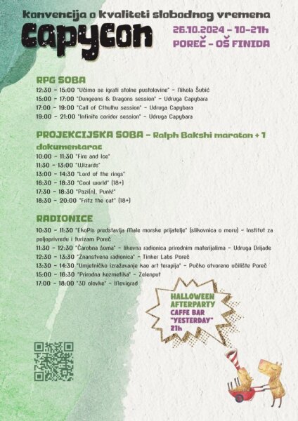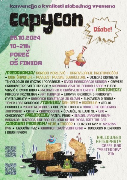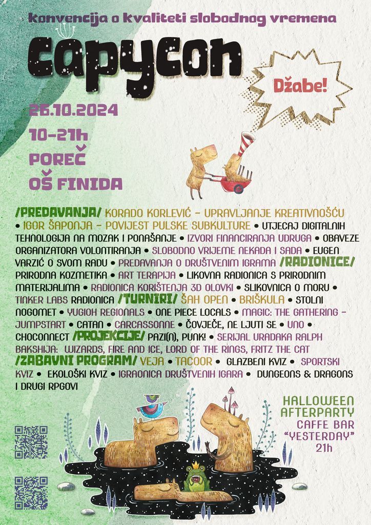 CapyCon, jedinstvena konvencija posvećena kvaliteti slobodnog vremena, bit će održana 26. listopada u Poreču. Mjesto događanja je Osnovna škola Finida, a od 10 do 21 sat posjetitelji svih uzrasta moći će uživati u nizu aktivnosti, igara i radionica koje su pripremile brojne udruge i organizacije.
