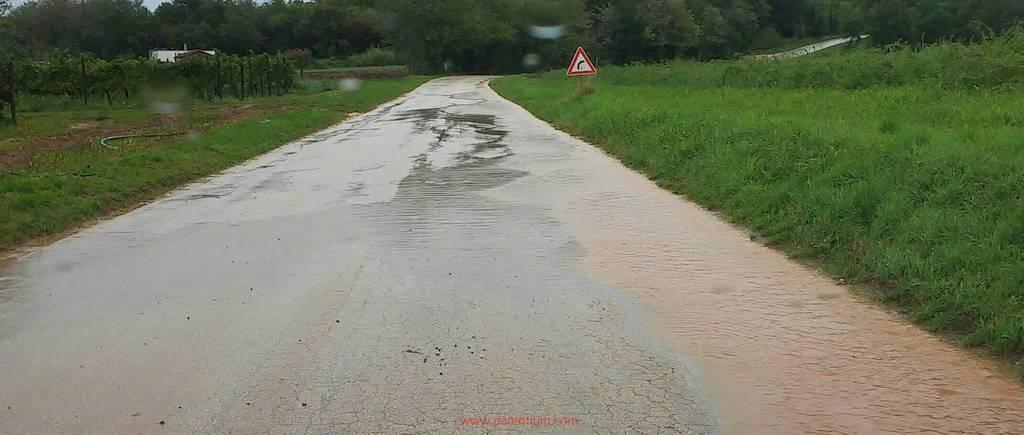 Takva je situacija opasna za vozila, ali i za bicikliste koji tu prometnicu često koriste, upozorava čitatelj koji nam je poslao fotografije. Proteklih je godina bilo i situacija u kojima bi na cestu iz smjera Mugebe nagrnulo toliko vode da onemogući promet vozila.