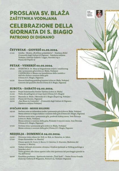 Na Župnom trgu bit će organizirana Marenda sv. Blaža od 10 do 13 sati, dok će u Zajednici Talijana Vodnjan biti održan program "San Biaso in Comunita" u 19 sati.
