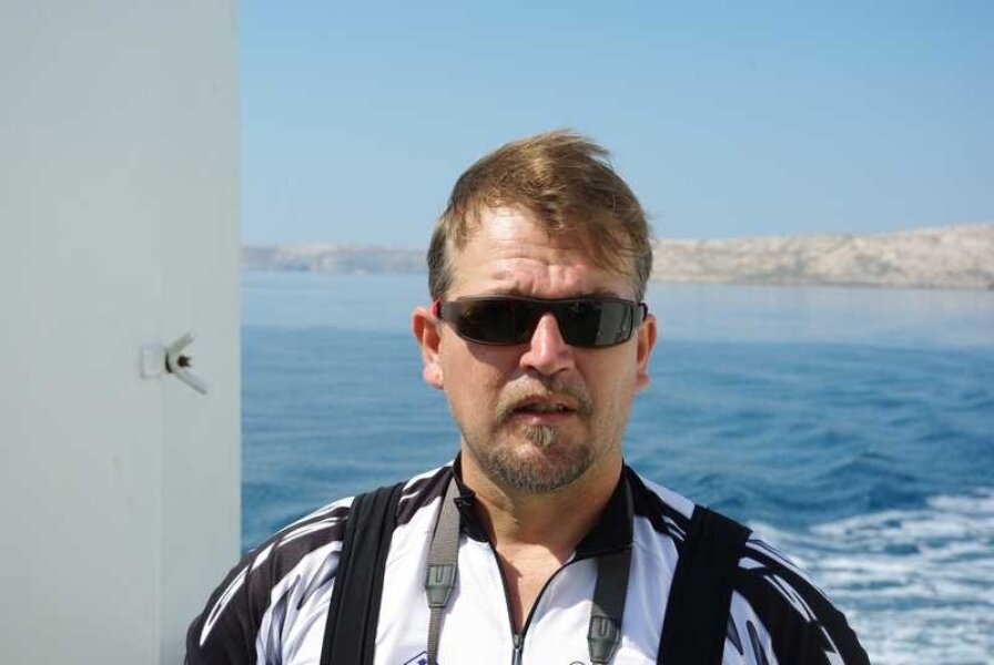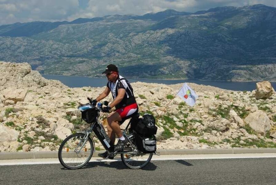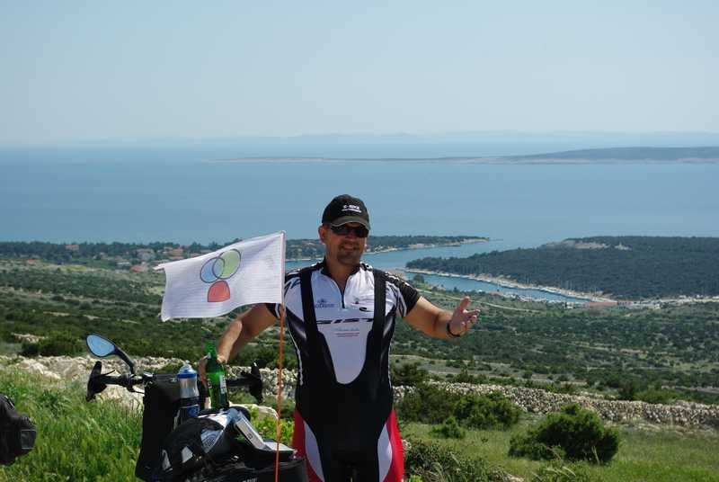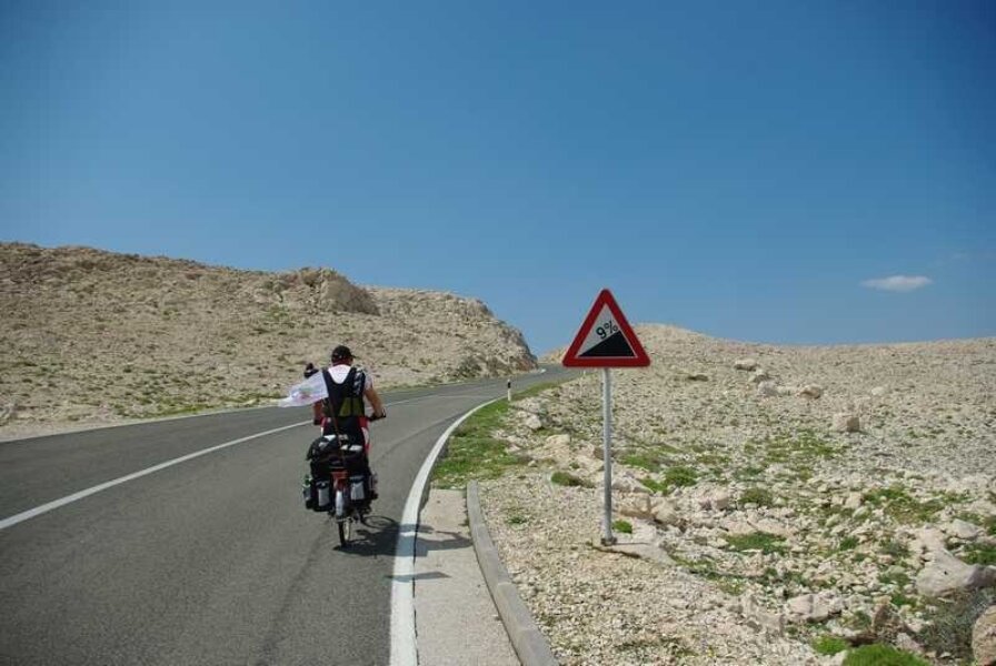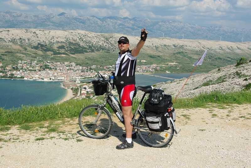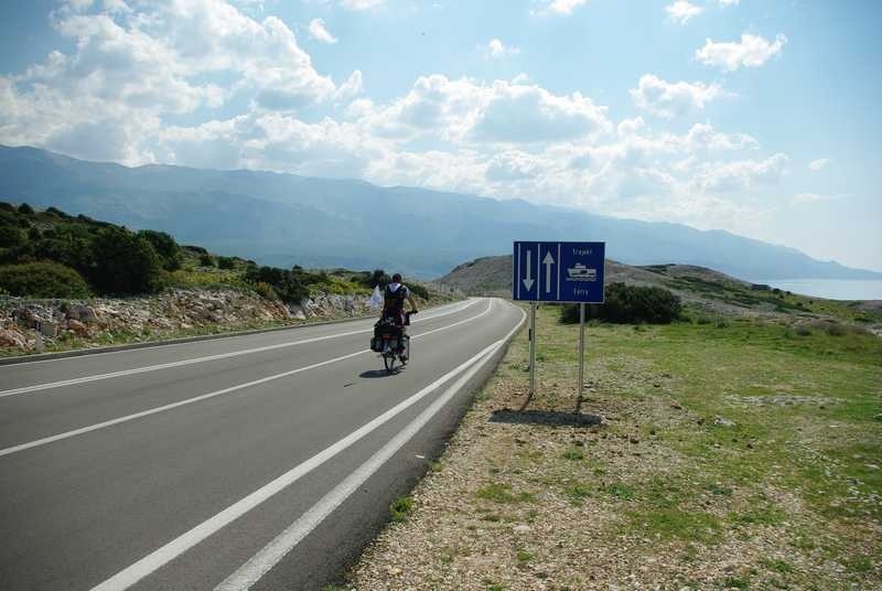 Ajme, majko mila! Knedla mi se u grlu stisnula i pokušavam je potisnuti izotoničnim napitkom (kao da će mi on pomoći!). Pa zar me svaki otok mora dočekati sa svojim najjačim adutima…kao da se ne bismo mogli prije sprijateljiti!? Kad me ovaj uspon nije uništio, znači da više ništa i ne može! 9 – 10 % konstantno! Ali potom spust odakle je ostao memoriran podatak o najvećoj postignutoj brzini do sada – 67 km/h! Dok sam „vruć“ nastavljam put Paga, a Njapo skreće za Novalju po namirnice. Vožnja po tom otoku je nešto zbilja posebno…nešto poput Route 66 (interesantno da naši ljudi više poznaju Ameriku, nego svoj zavičaj. Dokaz je tome činjenica da moram koristiti ovakve usporedbe!) Duga cesta koja se diže i spušta unedogled. Tu sam razvio posebnu tehniku savladavanja ovakvih trasa. Šiltericu do nosa, da možete vidjeti samo dva metra ispred sebe i …nogu pred nogu….cik, ciiiik…cik, ciiik…..Kilometar po kilometar!