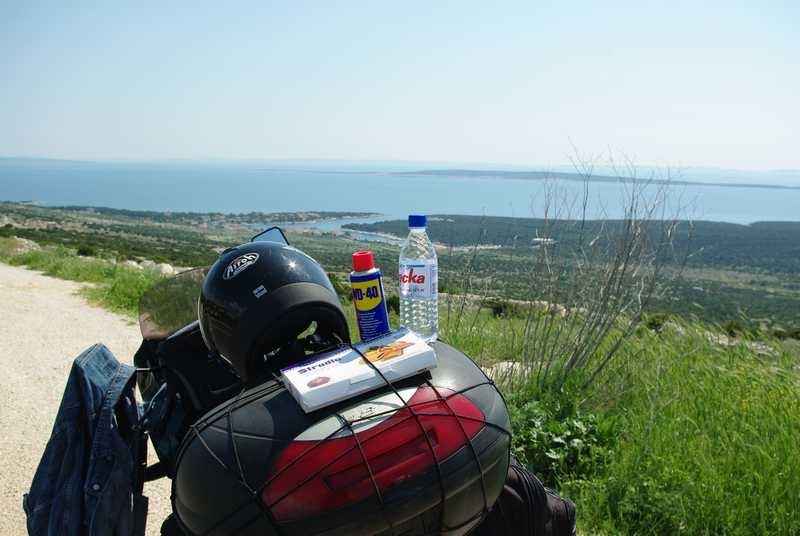 Mnjamm! Njapo me tu napušta, odlazi u potragu za današnjim konakom, a ja testiram čudo moderne tehnike, 1GB muzike koju mi je Vošten spremio u Njoku. Nakon cca sat i pol lagane vožnje stižem na Paški most gdje me čeka Njapo i tu obavljamo triumfalno slikanje. Poslije 8 km stižemo u Rtinu, odakle vam se i javljam. Na brojaču kilometara – stotka! UUeeee! To me je zanimalo…mogu li stotku? Sada znam da mogu!