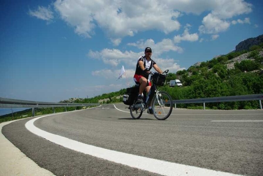 Spust je obrnuto proporcionalan usponu iz Jablanca! Na pola spusta osjetio sam smrad gumica kočnica. Majke mi! U Prizni putnici koji čekaju trajekt, zainteresirano obilaze oko e-bikea, pa sam iskoristio vrijeme održavajući terensku prezentaciju. Morao sam im pričati i otkud potiče Ladonjina zastavica koja još uvijek uspješno vije sa „antene“, usprkos vjetru koji je stotinama kilometara nastoji slomiti.