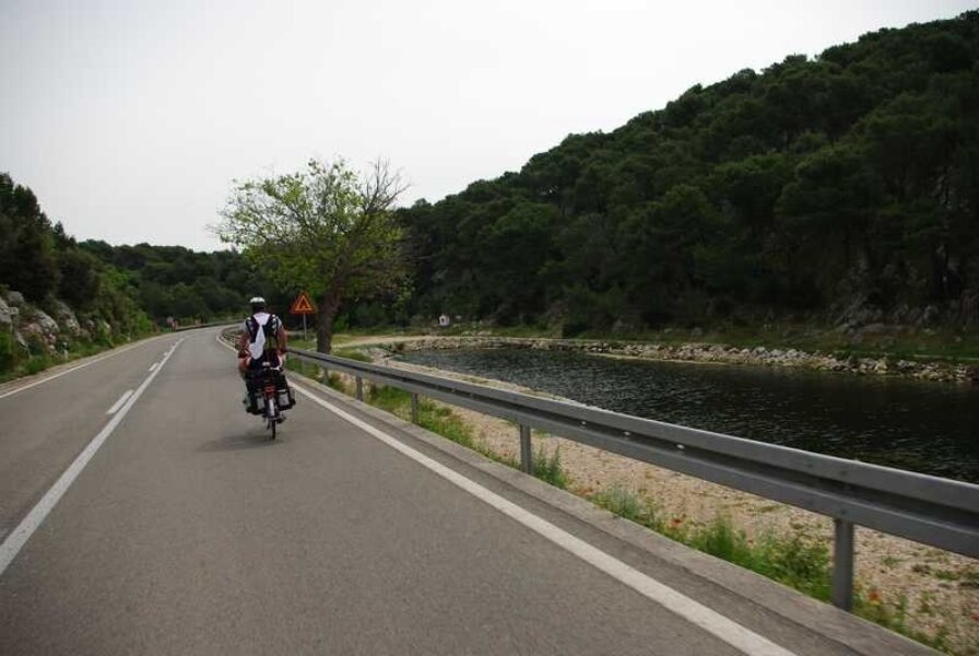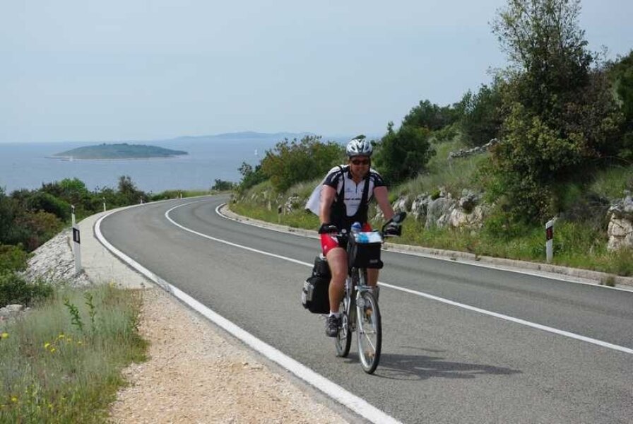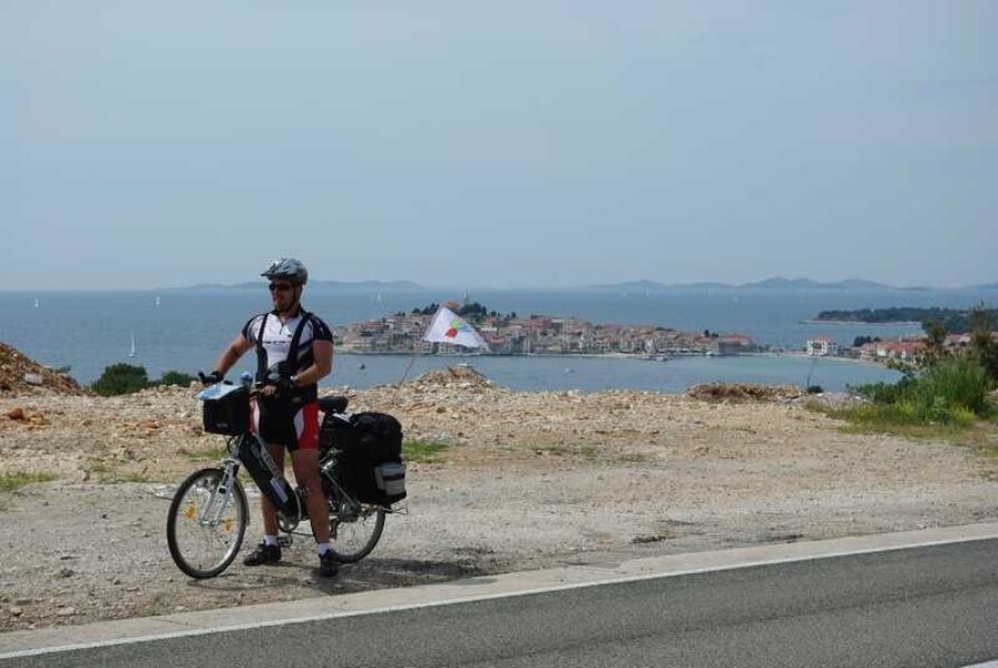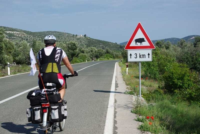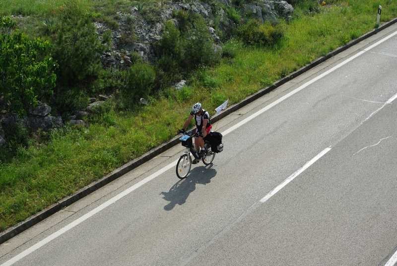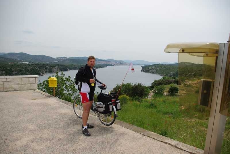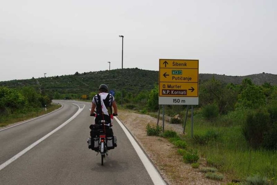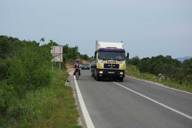 Nastavljam sam prema Primoštenu. Očekujem da u retrovizoru ugledam Njapinu siluetu, ali njega nema, pa nema. Tad sam shvatio koliko sam se naviknuo na pratnju i kako bi to izgledalo da sam sam na cesti. U najmanju ruku puno neugodnije. I još jedan savjet za bicikliste koji namjeravaju „peglati“ Magistralu: obavezno imajte retrovizor na volanu, jer kamiondžije su malo nervozni što moraju zaobilaziti jedno tako malo vozilo kao što je bicikl