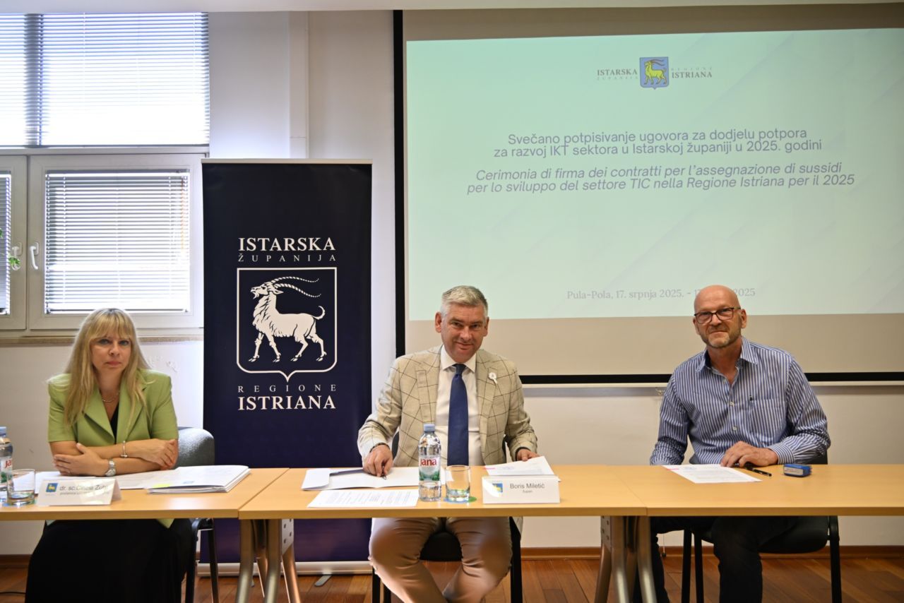U Puli je potpisano pet ugovora s poduzetnicima iz Pule, Umaga i Medulina, kojima je dodijeljena ukupna potpora od 40.000 eura za razvoj IKT sektora u Istarskoj županiji. Time Županija nastavlja s konkretnim mjerama za jačanje lokalnog gospodarstva i digitalne transformacije.