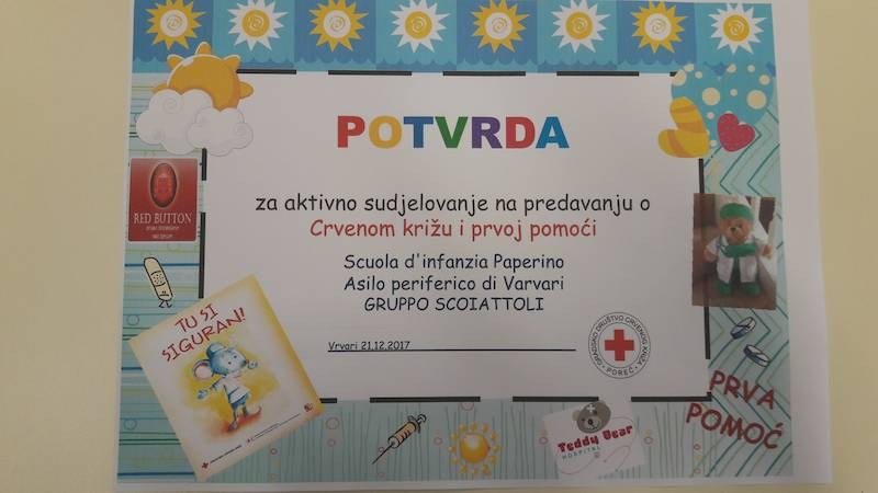 Danas su djelatnici porečkog Crvenog križa Ana Fariš i Igor Ostojić posjetili talijanski dječji vrtić i jaslice „Paperino“, tj. područni vrtić u Varvarima gdje su preuzeli namirnice koje su roditelji odgojnih skupina skupili za sugrađane kojima je to potrebno.