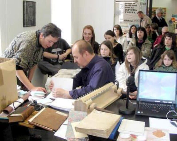 - Kažu da je knjiga dobro uvezana ako je možete držati za jednu stranicu, rekla je jedna gospođa, a majstor knjigoveža odmah je na jednom svom uratku okupljenima pokazao da je tome doista tako. Neki su se okušali u šivanju araka posebnim koncem, dok su drugi škarama uklanjali stare niti, pripremajući raspadnute listove za novo uvezivanje.