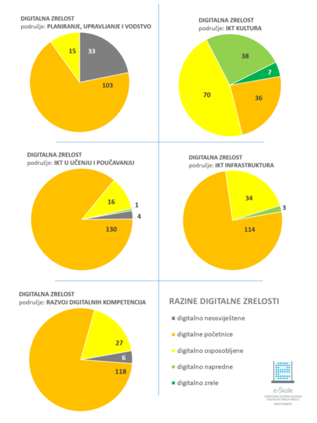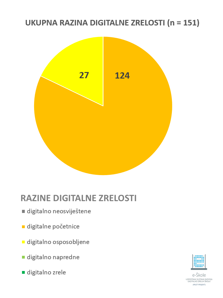 U sklopu pilot projekta „e-Škole: Uspostava sustava razvoja digitalno zrelih škola“ kojeg provodi Hrvatska akademska i istraživačka mreža – CARNet, tijekom proteklog je mjeseca provedena evaluacija razine digitalne zrelosti u 10 % hrvatskih osnovnih i srednjih škola. Rezultati pokazuju kako našim školama predstoji još puno posla po ovom pitanju jer su na skali od 1 (digitalno neosviještene škole) do 5 (digitalno zrele škole), naše škole dobile prosječnu ocjenu 2 što ih svrstava u kategoriju – digitalnih početnica.