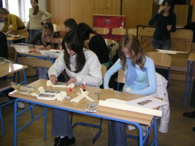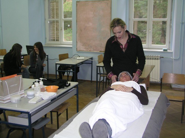 , našeg bivšeg učenika, učenici su imali prilike uživo pratiti demonstraciju tretmana lica čokoladom i pogledati film o masaži čokoladom. U drugoj radionici učenici su izrađivali kozmetičke preparate na bazi eteričnih ulja i čokolade (kreme, sapuni i sl.). Učenici komercijalne struke u holu škole prezentirali su postupak pravljenja čokoladnog fondija. [slika3][slika4]