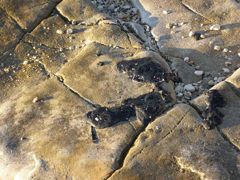Pogledom iz još veće blizine vidjeli smo da se tu nedavno doista radilo o izlijevanju masne crne tvari, najvjerojatnije mazuta. Tragovi slični katranu ostali su na mjestima kao manje nakupine, a na nekim drugima kao fina crna mreža. Zahvaćena površina koju smo primijetili proteže se na nekoliko stotina metara od ognjišta i dimnjaka na punti prema lučici okrenutoj ka Červaru.