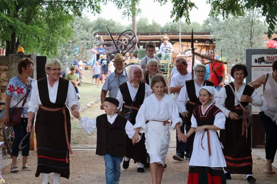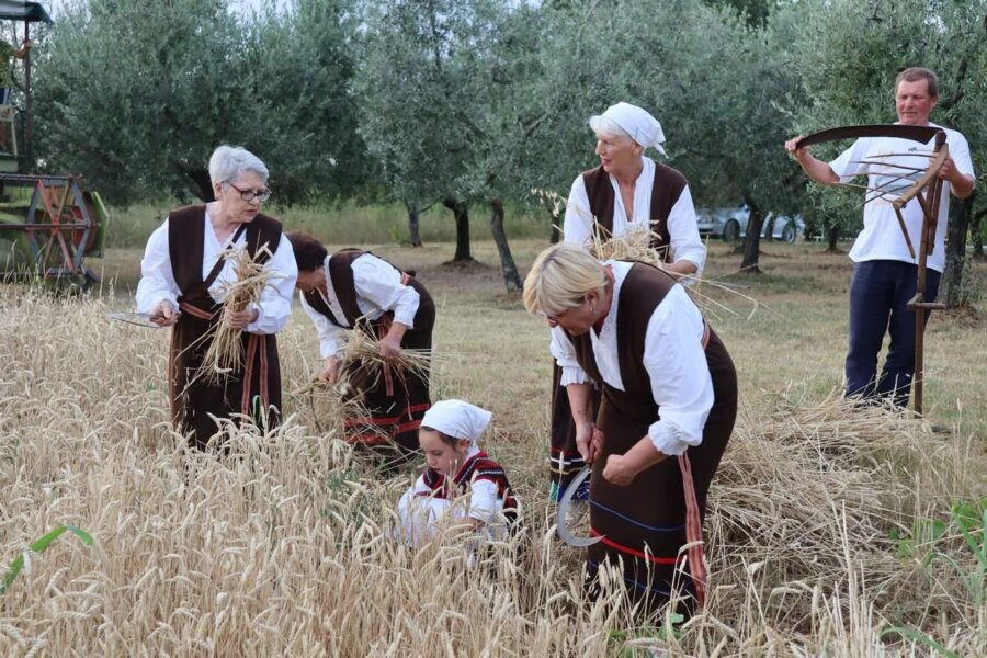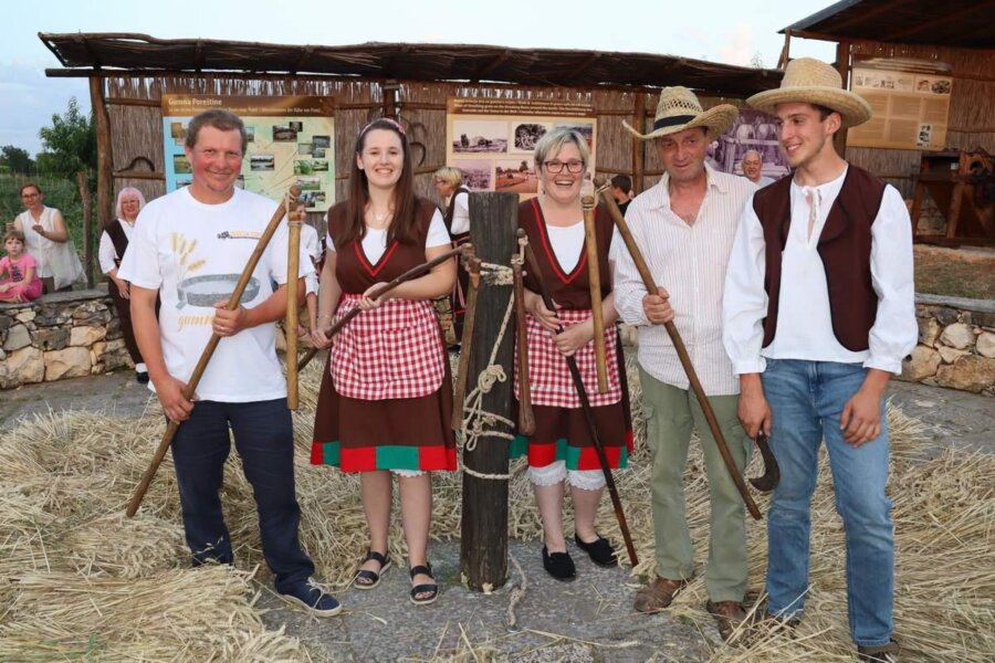 Imali su posjetitelji Fešte na gumnu, nakon što su s guštom odgledali sve predstavljene radove i veselo zapljeskali težakima, koje je također čekala zaslužena marenda, na raspolaganju štošta za pojesti i popiti, a Silvija Legovića, organizatora i dirigenta cijele ove poučne i zabavne predstave, smo na kraju zamolili da predstavi sve uključene izvođače. Neka oproste ono koje ćemo možda izostaviti. Srpovima su pšenicu žele Ester Diklić, Nevenka Kocijančić, Mariza Jugovac, Slavica Ezgeta i drugi iz etno-skupine Nigrignanum iz Labinci, kosci su bili Mario Gašparini i Igor Cvitko, kosilicom-samovezačicom je upravljao Nini Legović, kombajne su vozili Damir Lukež, Roberto Legović i Mateo Legović, cipima su žito vršili Helga Diklić, Sara Diklić, Nini Legović i Igor Cvitko; Drago Žužić je vozio snopove iz vale, a na makini su pšenicu ovršili Leonard Janko, Igor Cvitko, Nini Legović i Silvio Legović. Tovare je po gumnu vodio Mario Gašparini, a svog je tovara doveo i Nevio Valenta.