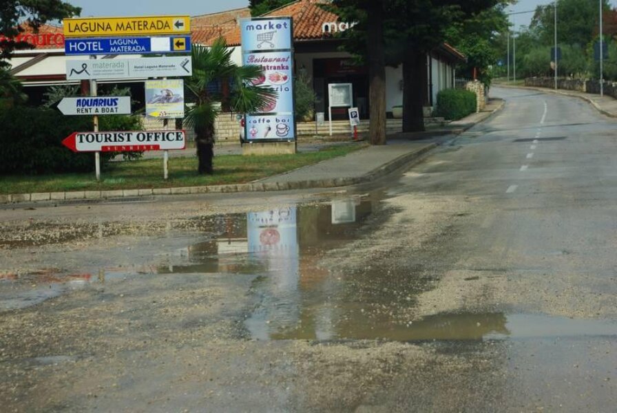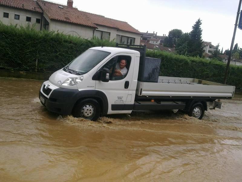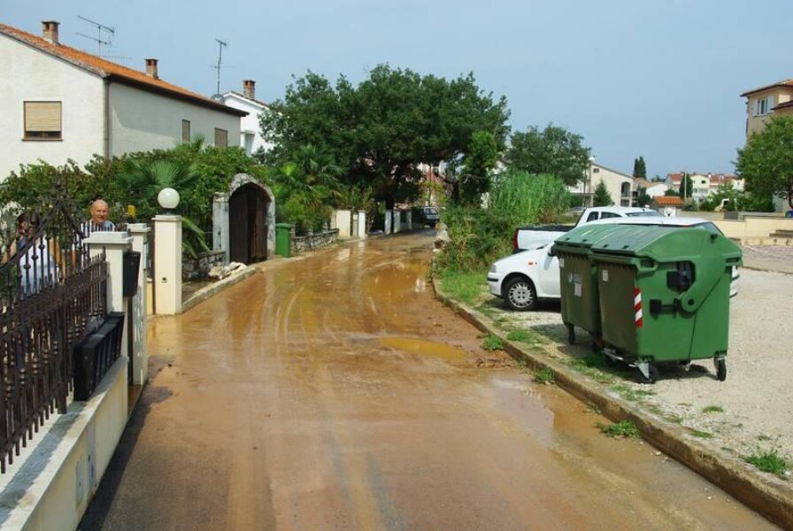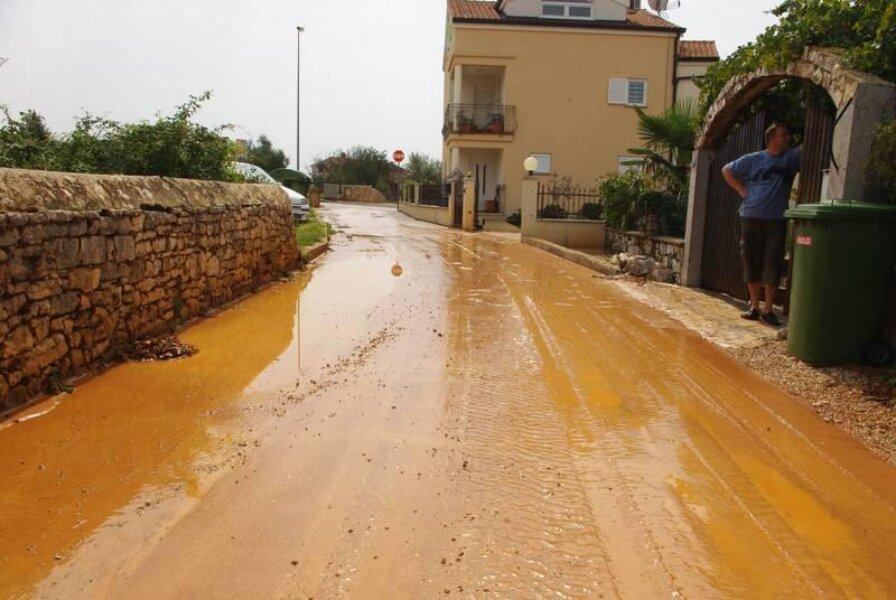 I današnje je grmljavinsko nevrijeme iznenadilo komunalnu infrastrukturu grada sa pet zvjezdica: ulica Mate Vlašića, jedna od najvažnijih gradskih arterija, desetak je minuta bila korito potoka nastalog na njenom vrhu, koji je sa sobom sa gradilišta u grad odnio hrpe šljunka i raznog smeća. Tuča i kiša padali su i na području Kaštelira. Još je tragičnija situacija bila u Velom Maju u kojem je obitelj Hamaček po ne zna se koji put iz prizemlja svoje obiteljske kuće praznila vodu i žitko blato. Budući se nalaze na najnižoj točki Ulice Piante (nižoj i od rešetke oborinske kanalizacije), bujica im je u dvorište i kuću donijela hrpu blata i smeća pokupljenog od tamošnje područne osnovne škole, pa preko napuštenog gradilišta takozvanog "Servo Mihalja 2".