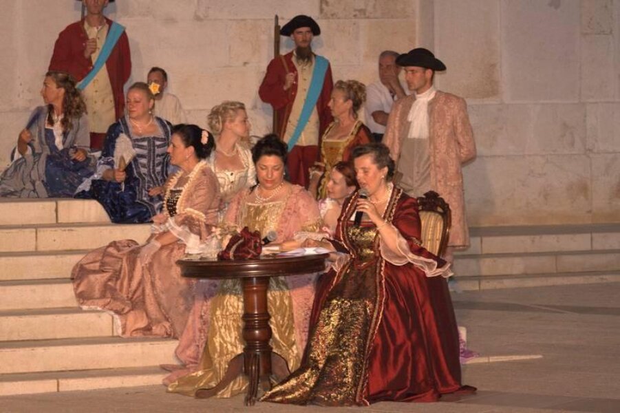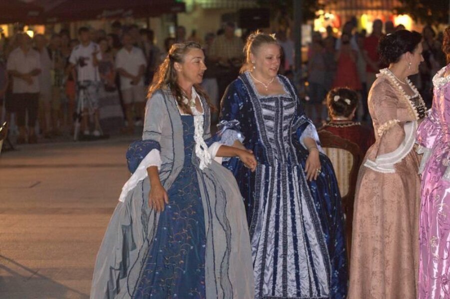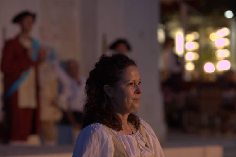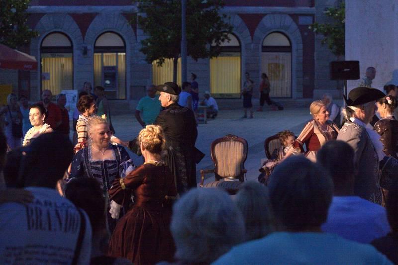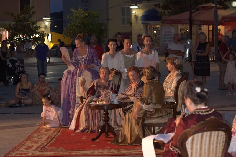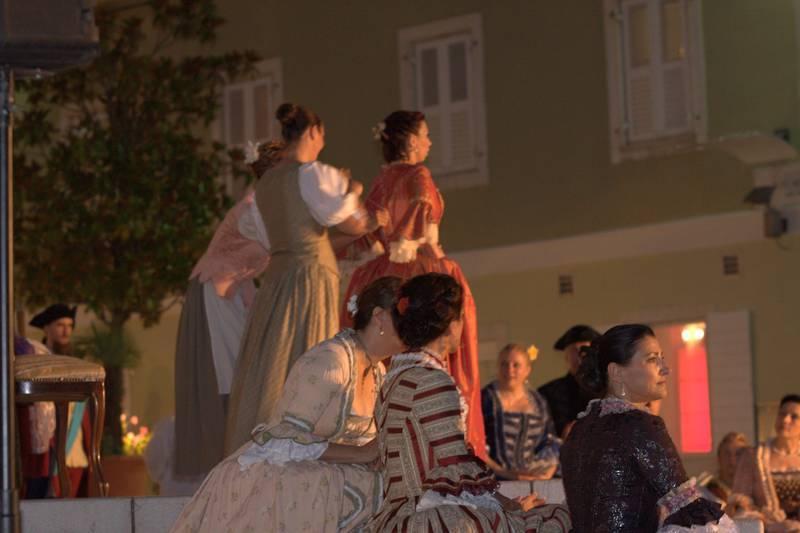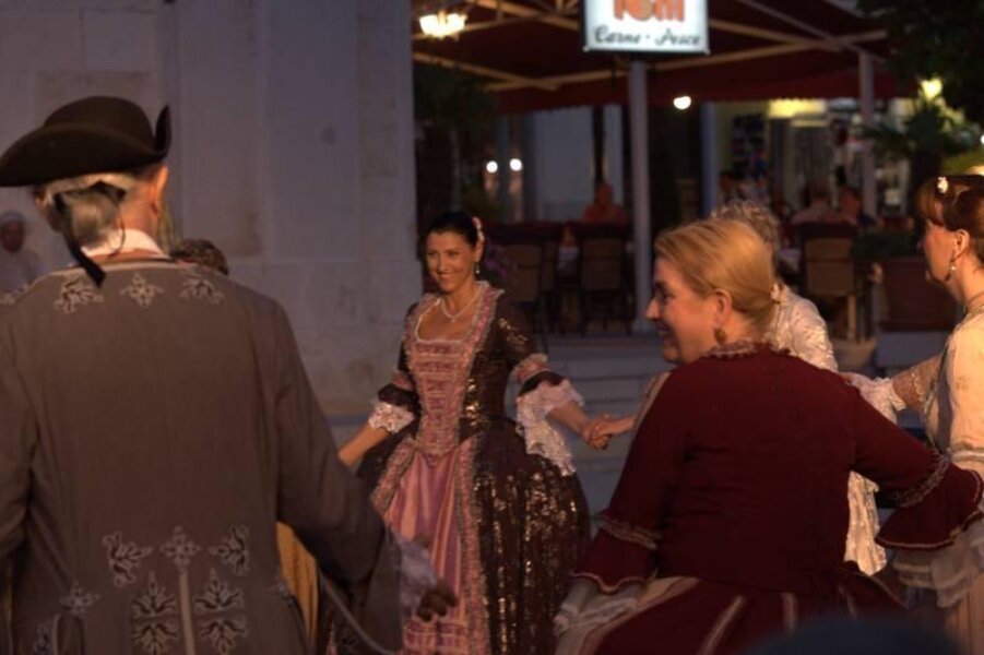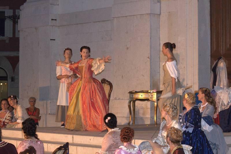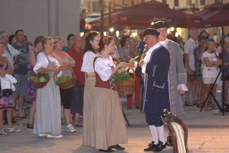Članovi Društva prijatelja Giostre su prekjučer u 21 sat izveli svoj prvi ljetni nastup na Trgu slobode. Na stepenicama ispred Crkve Gospe od anđela su plemići i pučani, mačevaoci i dobošari izvodili skečeve i plesali, nastojeći turistima prikazati sliku Poreča u vremenu baroka.