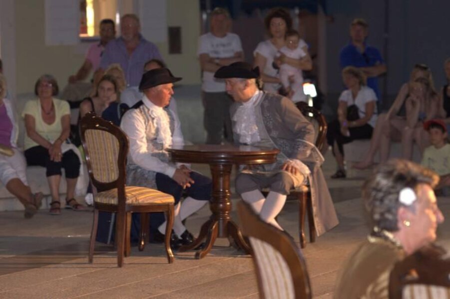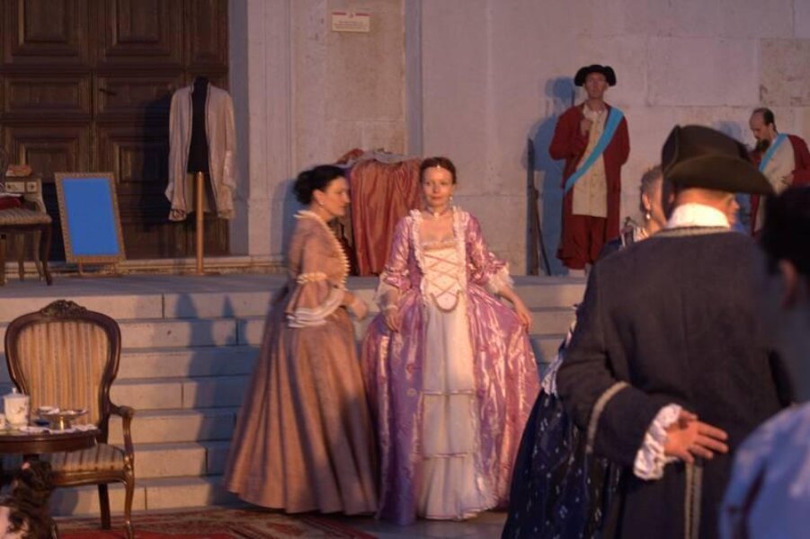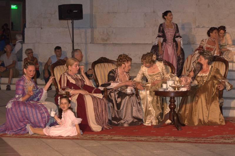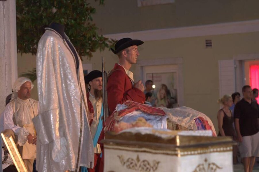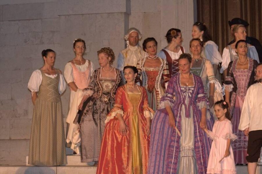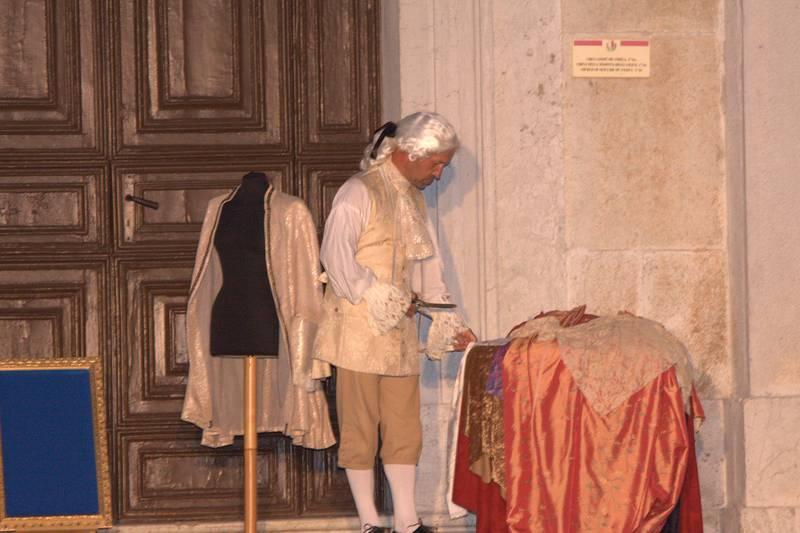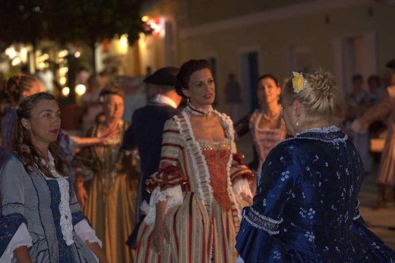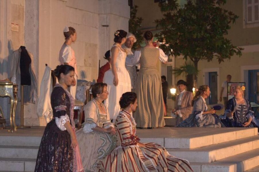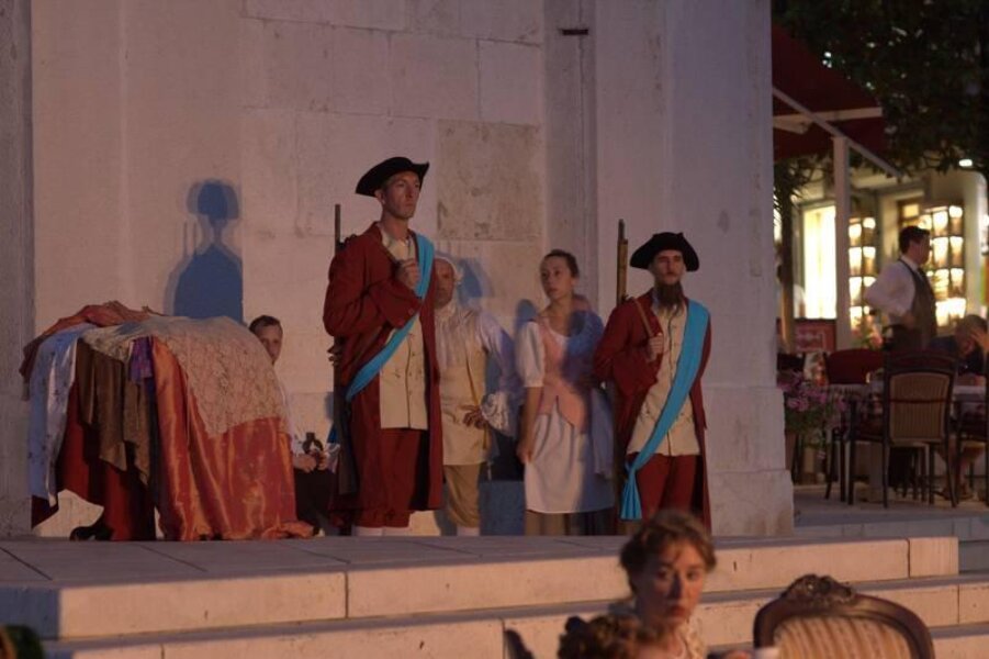 Članovi Društva prijatelja Giostre su prekjučer u 21 sat izveli svoj prvi ljetni nastup na Trgu slobode. Na stepenicama ispred Crkve Gospe od anđela su plemići i pučani, mačevaoci i dobošari izvodili skečeve i plesali, nastojeći turistima prikazati sliku Poreča u vremenu baroka.