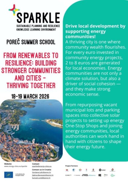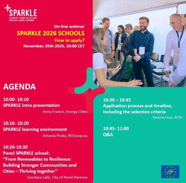 Sudionici će imati priliku doznati više o pet međunarodnih škola SPARKLE koje će se održati 2026. godine, u europskim centrima učenja – Poreču, Guimãraesu, Calenzanu, Vilniusu i Albertvilleu. Škole nude praktične radionice o energetskim zajednicama, održivom planiranju i gospodarstvima koja pametno koriste resurse, uz pokriće troškova puta i boravka.