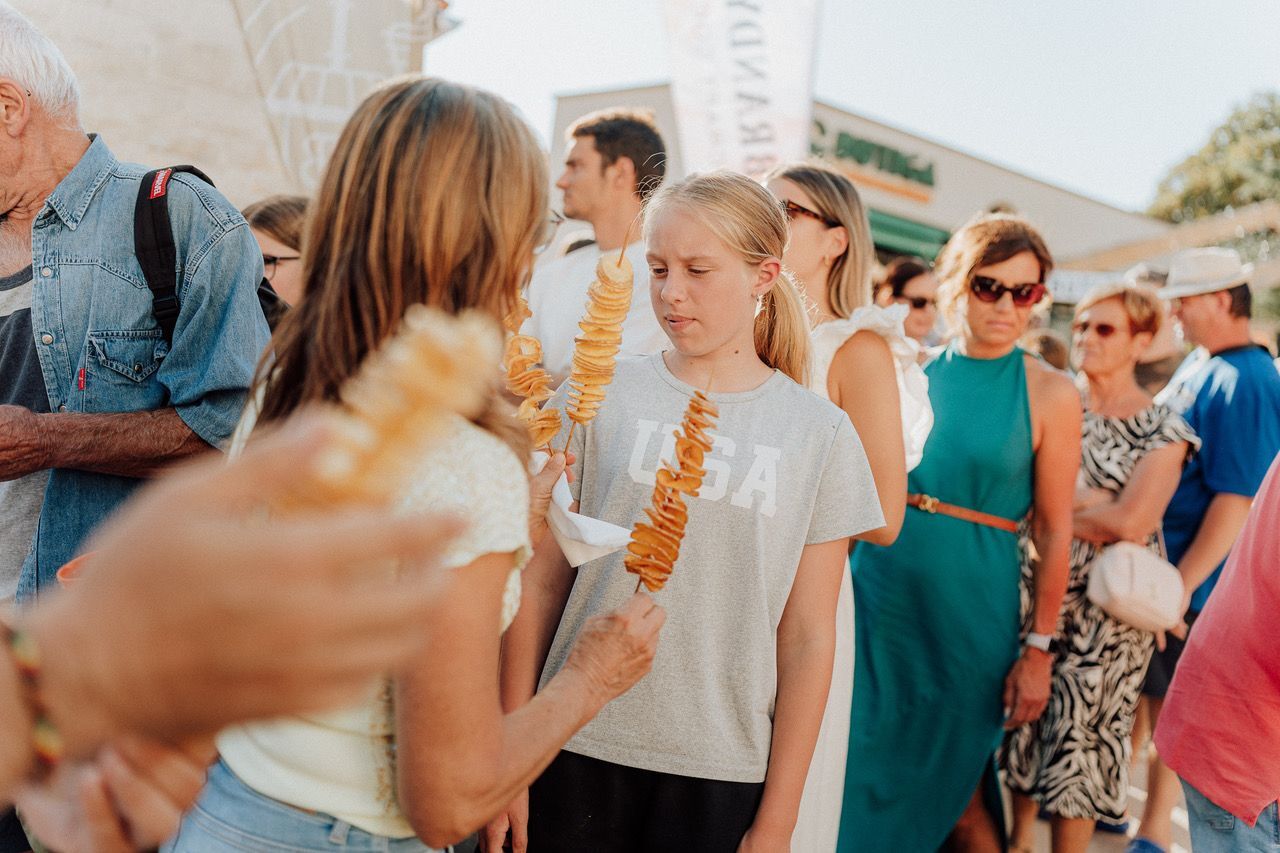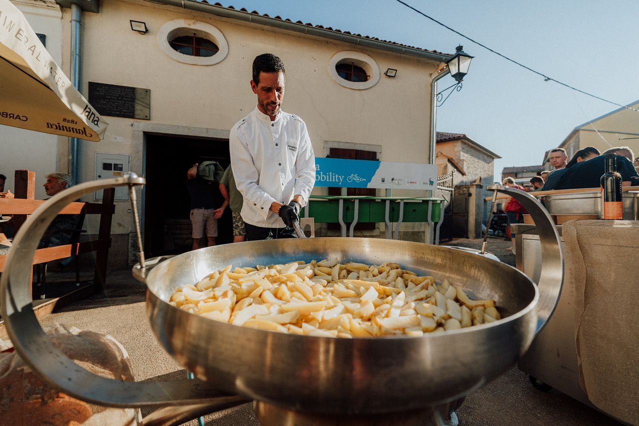 Hit večeri bio je Broštulani gramper s orihi, zaštićeno jelo manifestacije koje je pripremao poznati kuhar Gianpaolo Sardot. Za ljubitelje street food klasike posluženi su spiralni krumpirići i svježi pomfrit. Ove godine oboren je rekord – tijekom večeri pripremljeno je i pojedeno 600 kilograma krumpira. Hrana se dijelila besplatno uz prigodnu donaciju, a prikupljeni iznos namijenjen je Osnovnoj školi Jože Šuran iz Kaštelira za kulinarske radionice s djecom.