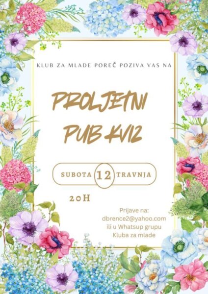 12.04.2025. | Subota | 20:00 | Kviz! Klub za mlade | Trg Antona Grabara 1, Poreč |