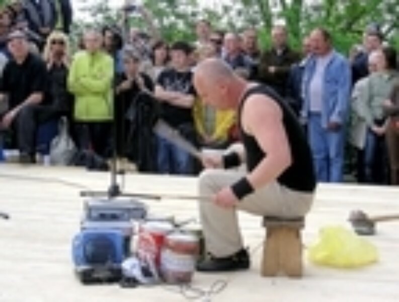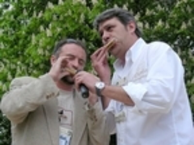 [slika3d]Niska pozornica od dasaka i improvizirano gledalište od bala slame prekrivenih jutenim vrećama bilo je poprište završnog programa druge Fešte pres štrumienti, koju su otvorili voditelj programa Robert Ferlin i glavni organizator Bruno Krajcar odsviravši (ili bolje rečeno: odnjrčavši) istarsku himnu na »njrčalicama« od trske. Nitko nije, pa ni voditelj Ferlin, imao potpuni i konačni popis izvođača, jer su se mnogi sa željom da nastupe javljali na licu mjesta. Redali su se tako, jedni za drugima, skupine i pojedinci, svirači na stotinama predmeta sposobnim za proizvodnju melodičnog ili ritmičnog zvuka te izvođači koji su za instrument imali tek vlastite glasne žice i usne šupljine kojima su imitirali zvukove pravih instrumenata, ili pak zapjevali u tehnikama njegovanima samo u usko definiranim zemljopisnim područjima.