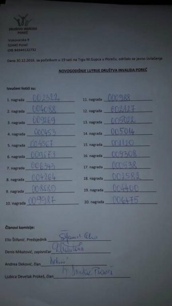 Izvučene dobitne srećke Novogodišnje lutrije Društva invalida Poreč