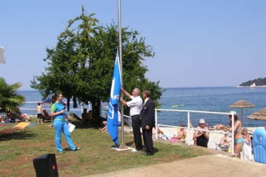 Iako je podizanje plave zastave na plaži poput one na porečkom „Jedru“ koje je u subotu u 11:00 upriličila porečka „Riviera“ vrijedan događaj, na njemu nije bilo službenih predstavnika lokalne vlasti, pa smo imali sljedeću situaciju: djevojka obučena u boje FEEE (Foundation for Environmental Education in Europe) izgovorila je po nekoliko riječi na hrvatskom i relativno pristojnim engleskom i talijanskom (ali jako lošem njemačkom) jeziku, nakon čega je stari „Rivierin“ gost plavu zastavu podigao na jarbol uz intoniranje hrvatske nacionalne himne „Lijepa naša“.