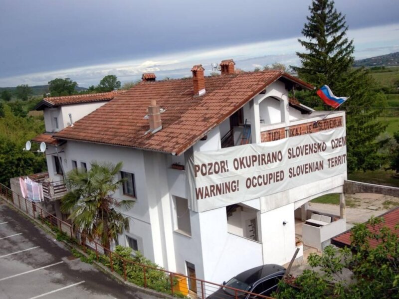Joško Joras je na svoju kuću, kao i 2010. godine, izvjesio transparent sa natpisom "Pažnja! Okupirana slovenska zemlja", a nastavio je s radovima na kopanju kanala za vodovodne cijevi. Od našeg zadnjeg posjeta, proteklog petka, bio je tek prokopao kanal do ceste, a sada je radove nastavio od kuće prema već prokopanom kanalu. Do završetka ostalo mu je svega dvadesetak metara.