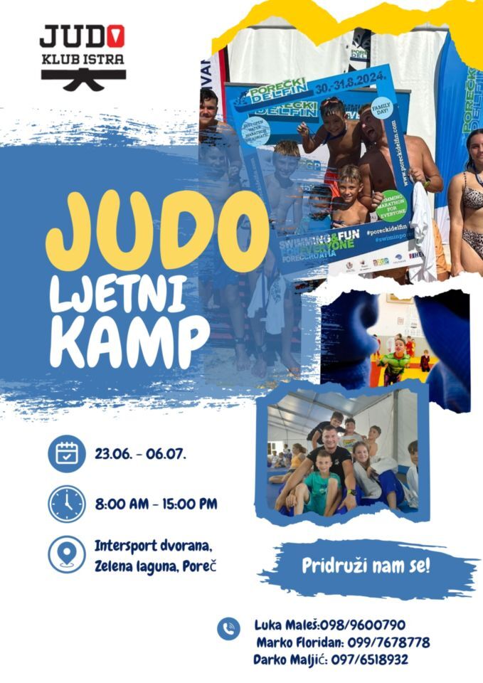 U Intersport dvorani u Zelenoj laguni u Poreču bit će održan judo ljetni kamp od 23. lipnja do 6. srpnja, svaki dan od 8 do 15 sati. Kamp je namijenjen djeci svih dobnih uzrasta koja već treniraju judo, ali i onima koji se tek žele okušati u ovom sportu.