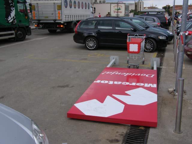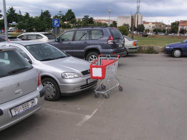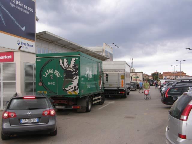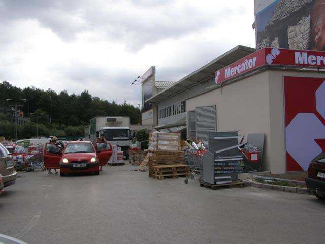 Mercator ni danas nije sredio svoje skladište, nego robu skladišti na cesti, odnosno na nekoliko parkirališta zauzetih za tu potrebu. Osim toga, nema tko pokupiti shopping kolica koja kupci posvuda ostavljaju, a i veliki reklamni pano leži na parkiralištu zauzimajući ga i čekajući da ga netko postavi na strateško mjesto.