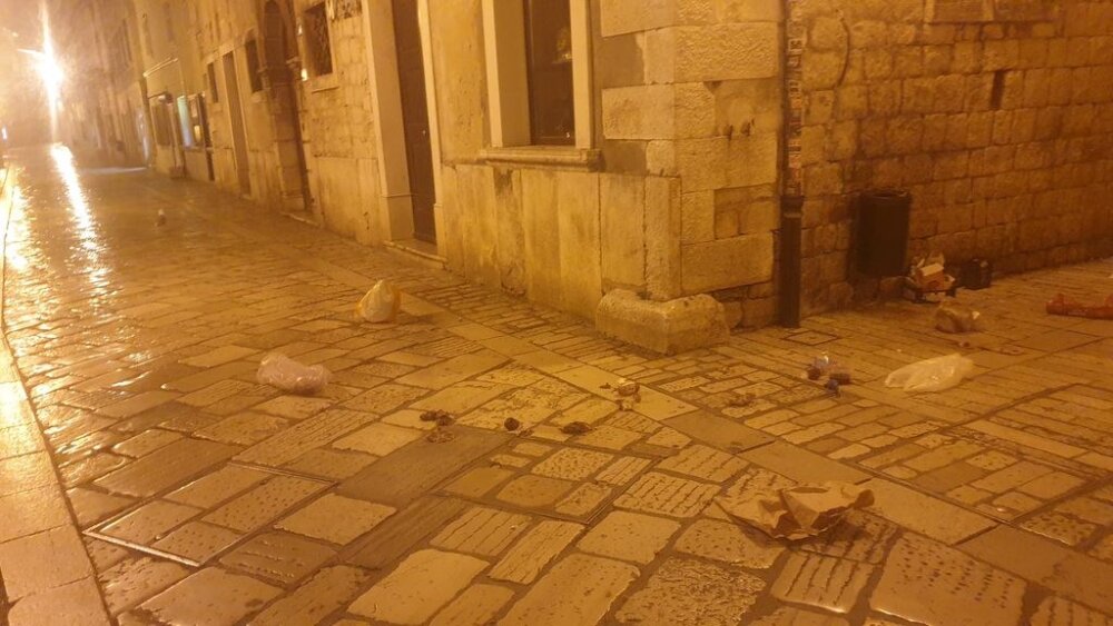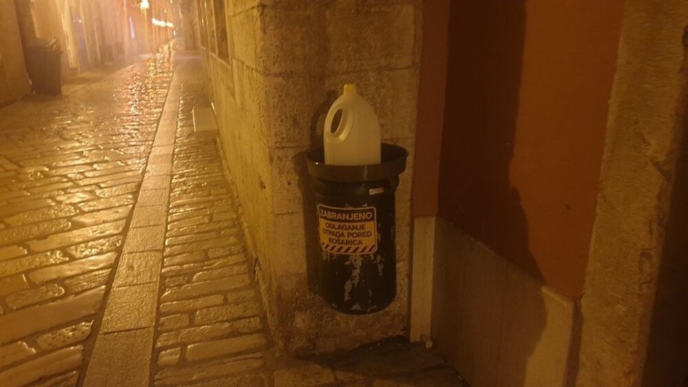 Ovako naš grad izgleda u 2:30 ujutro, prije nego vrijedni radnici Usluge dođu isprazniti kontejnere s komunalnim otpadom. No, sav njihov angažman i trud nisu dovoljni kad uvijek postoji netko tko svoj komunalni otpad „odlaže” u male koševe za smeće ili pored njih. (Ili se uvijek radi o istom neandertalcu?).