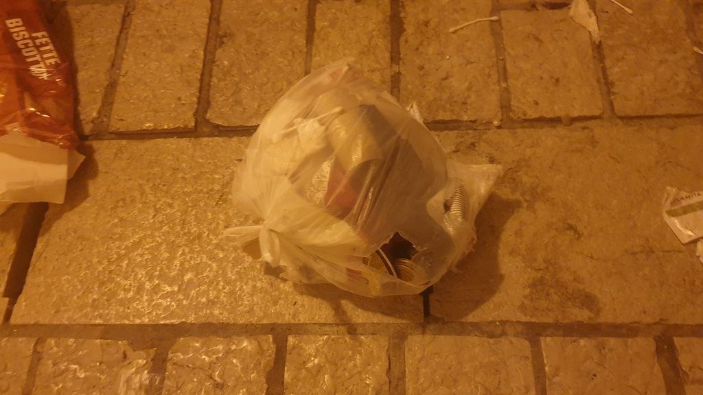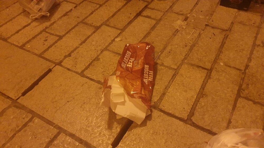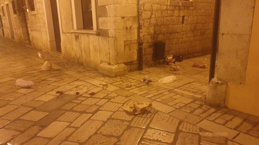 Ostaci hrane i ambalaže doslovno ispred gradskog muzeja i Eufrazijeve bazilike. Galeb je sve rasturio, rasturao je i dalje dok sam fotografirao.