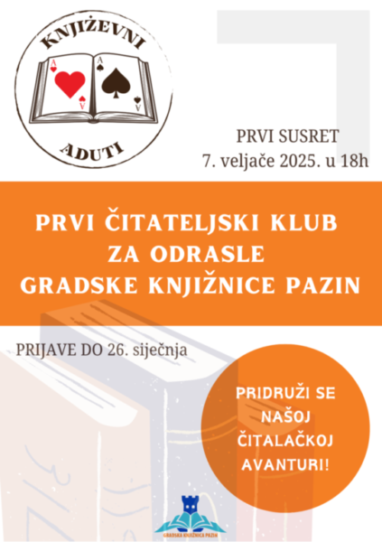 "Književni aduti", prvi čitateljski klub za odrasle u Pazinu, namijenjen je ljubiteljima rasprava o književnosti. Klub vodi Zoran Damjanović, a prvi sastanak bit će održan u 18 sati.