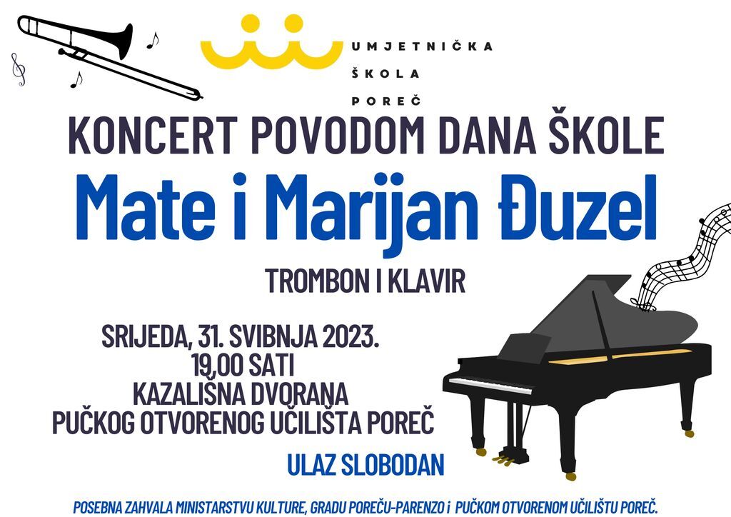 Braća Mate i Marijan Đuzel, poznati mladi klavirist i trombonist, nastupit će povodom Dana Umjetničke škole Poreč. Koncert će biti održan u srijedu, 31. svibnja u 19 sati u Kazališnoj dvorani Pučkog otvorenog učilišta Poreč.