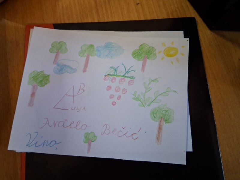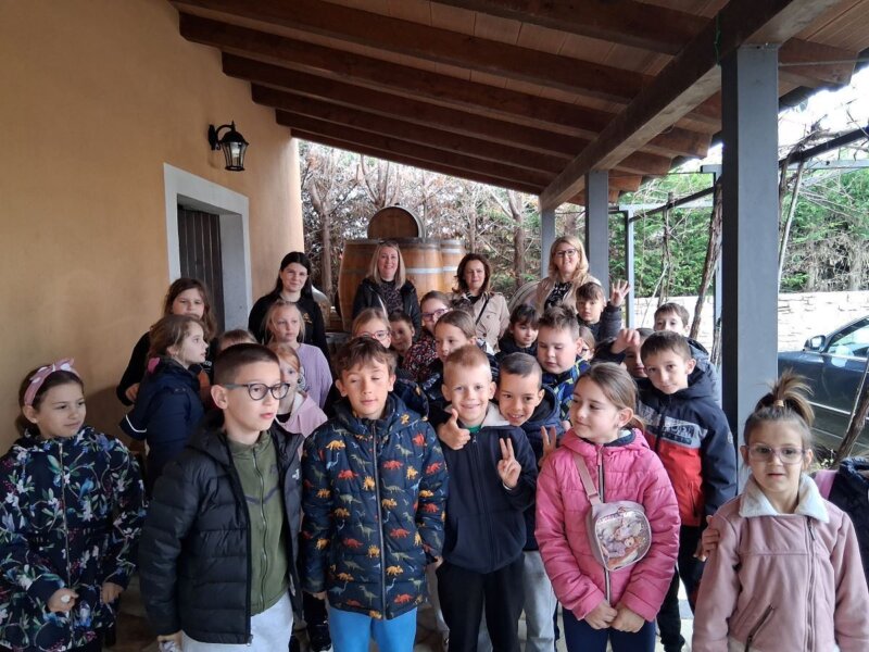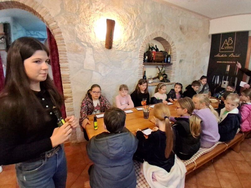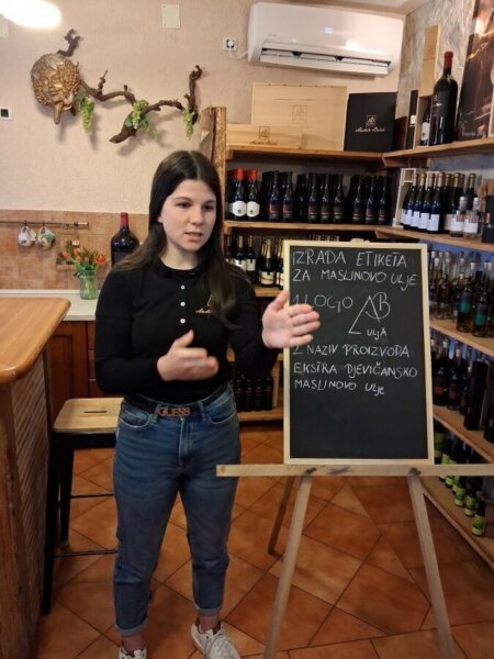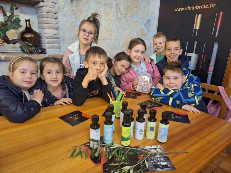 Osim vina, OPG Brčić proizvodi i maslinovo ulje, pa su učenici imali priliku aktivno sudjelovati u kreativnoj radionici. Svaki učenik osmislio je i izradio vlastitu etiketu za bočicu maslinovog ulja, koju su zatim sami napunili i ponijeli kući kao poklon roditeljima. Interaktivna aktivnost omogućila im je bolje razumijevanje proizvodnog procesa i važnosti poduzetništva u lokalnoj zajednici.
