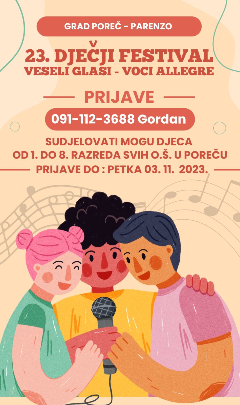 Prijave su otvorene, a mogu se prijaviti svi učenici od 1. do 8. razreda osnovnih škola Poreča. Rok prijave je 3. studenog. Za prijavu je potrebno javiti se voditelju festivala Gordanu Greguroviću na mobitel 091 112 3688.