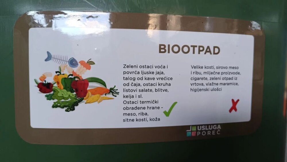 Uz spremnike svaki korisnik dobiva i bioorazgradive vrećice u koje se sakupljeni biootpad treba prvo odložiti, dobro zatvoriti, a nakon toga pune vrećice odložiti u same spremnike. Biootpad koji nastaje u kućanstvu čini kuhinjski otpad kao ostaci hrane, kore voća i povrća, ljuske jaja, talog kave, vrećice od čaja, ostaci kruha, filtera, papira i sl.