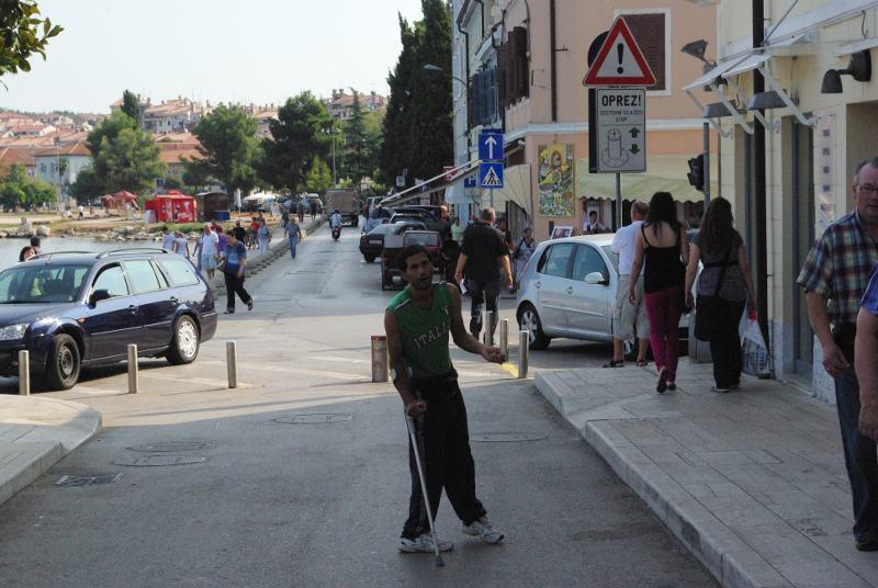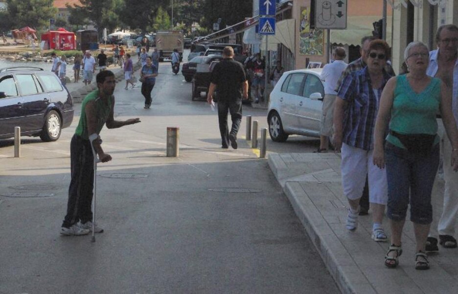 Danas smo napokon u objektiv fotoaparata uspjeli uhvatiti lažnog prosjaka koji svako toliko operira na području Poreča. Glumeći invaliditet na štakama bezobzirno presreće turiste i druge prolaznike i besramno se "baca" u grupe turista koji su u razgledavanju grada i za samo nekoliko minuta "zaradi" više nego prosječni radnik.