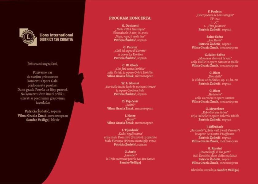 Na pozornicu će stati Patricia Žudetić (sopran), Vilma Grazia Žmak (mezzosopran) i Sandro Vešligaj (klavir), koji će izvesti poznate arije i duete iz operne literature. Ulaz je besplatan, a ulaznice se mogu preuzeti kod članova Lions Cluba Poreč, putem telefonskog broja +385 91 580 3097 ili sat vremena prije početka koncerta.