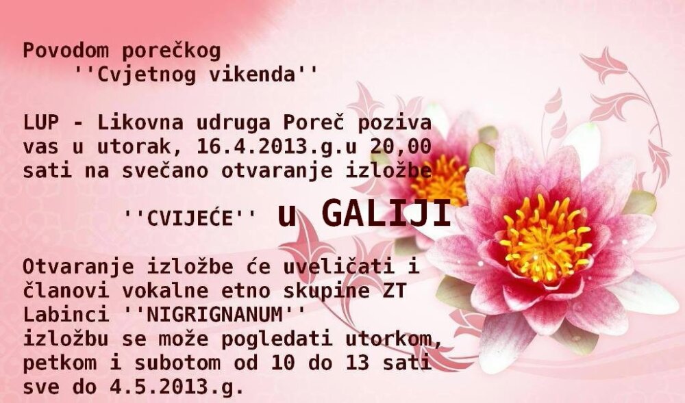 [slika1l]Već tradicionalno, uoči porečkog Cvjetnog vikenda koji se ove godine održava 22. i 21. travnja, Likovna udruga Poreč organizira izložbu na temu cvijeća. Svečano otvorenje izložbe održati će se u utorak, 16.4.2013. u 20,00 sati u galeriji ''Galija'' na trgu Joakima Rakovca u Poreču. Nekoliko prigodnih pjesama prilikom otvorenja zapjevati će vokalna etno skupina ''Nigrignanum'' ZT Labinci nakon čega će biti upriličena mala zakuska.