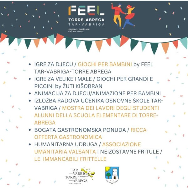 Cijelo događanje bit će upotpunjeno raznim sadržajima za sve uzraste: igre za djecu u organizaciji Feel Tar-Vabriga-Torre Abrega, zabava za velike i male u režiji udruge Žuti kišobran, animacija za najmlađe, izložba radova učenika škole te bogata gastronomska ponuda.