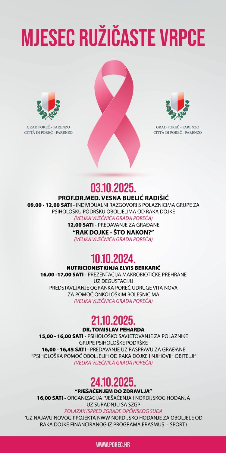 Listopad, Mjesec borbe protiv raka dojke, i ove će godine u Poreču biti obilježen nizom događanja. Grad Poreč u suradnji s liječnicima i udrugama priprema predavanja, konzultacije, psihološku podršku i javnozdravstvene akcije za građane. Cilj programa je podizanje svijesti o važnosti prevencije, ali i pružanje podrške oboljelima i njihovim obiteljima.