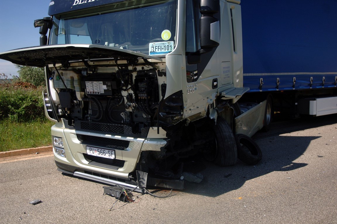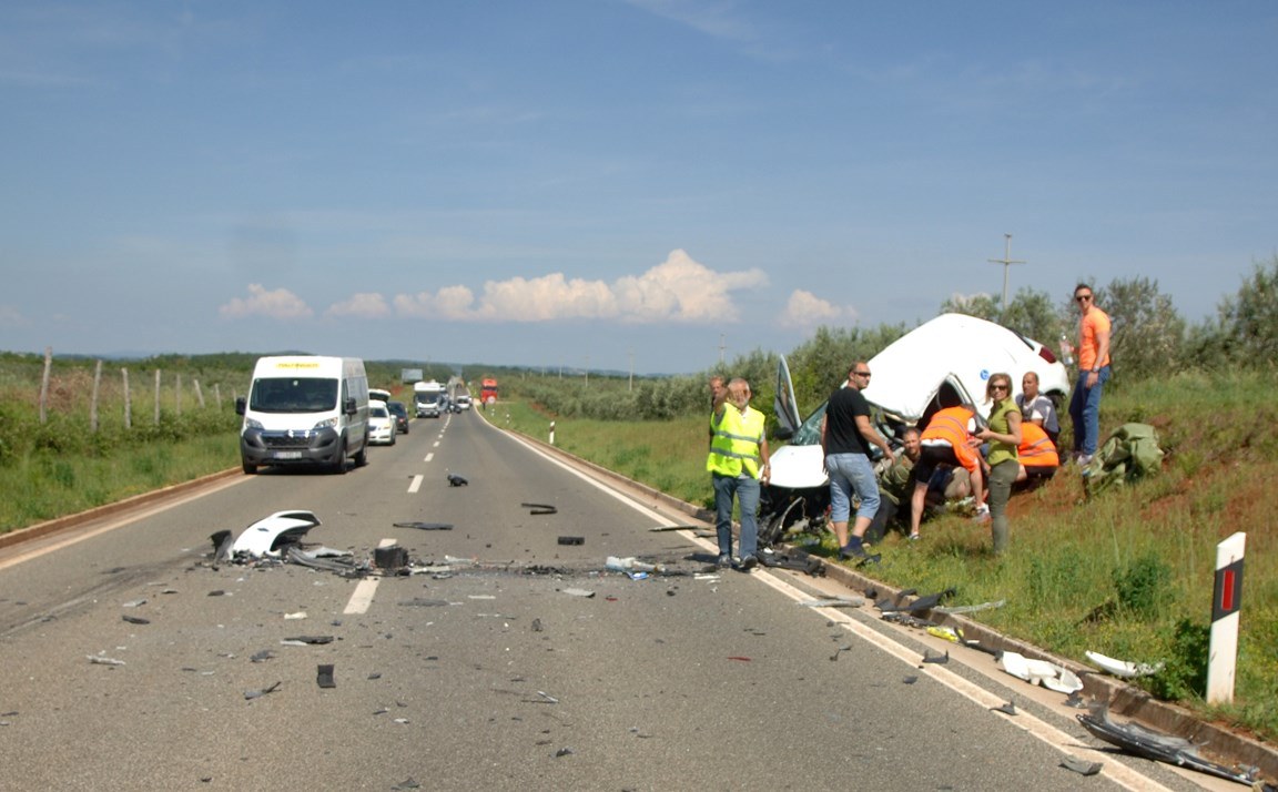 Na mjesto nesreće stigli smo desetak minuta nakon stravičnog sudara teretnjaka marke Iveco i manjeg dostavnog vozila Renault. Kamionom Iveco upravljao je vozač iz okolice Poreča, krećući se u smjeru Novigrada, dok je Renault dolazio iz suprotnog smjera, iz Novigrada. Do sraza je iz nepoznatog razloga došlo na strani kolnika na kojoj se nalazio teretnjak. Renault je doslovno odbijen preko suprotne trake na zemljano uzvišenje pored ceste.