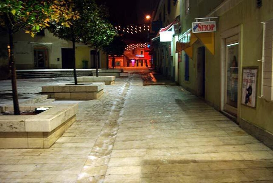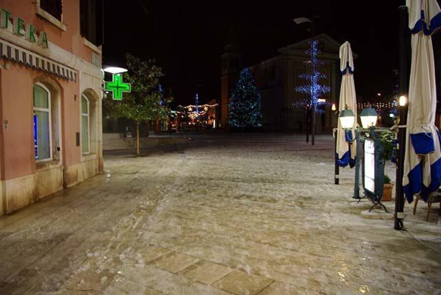 Šetnja Trgom slobode prava je avantura i za obične kiše, dok je večeras hodanje po njemu izuzetno opasno. Nigdje nismo zamijetili čak ni pokušaj čišćenja ili posipanja solju. Prema termometru u gradskoj marini, temperatura zraka je 1.3 stupnja Celzija. Ako tijekom noći dodatno zahladi, cijeli će se grad pretvoriti u veliko klizalište.
